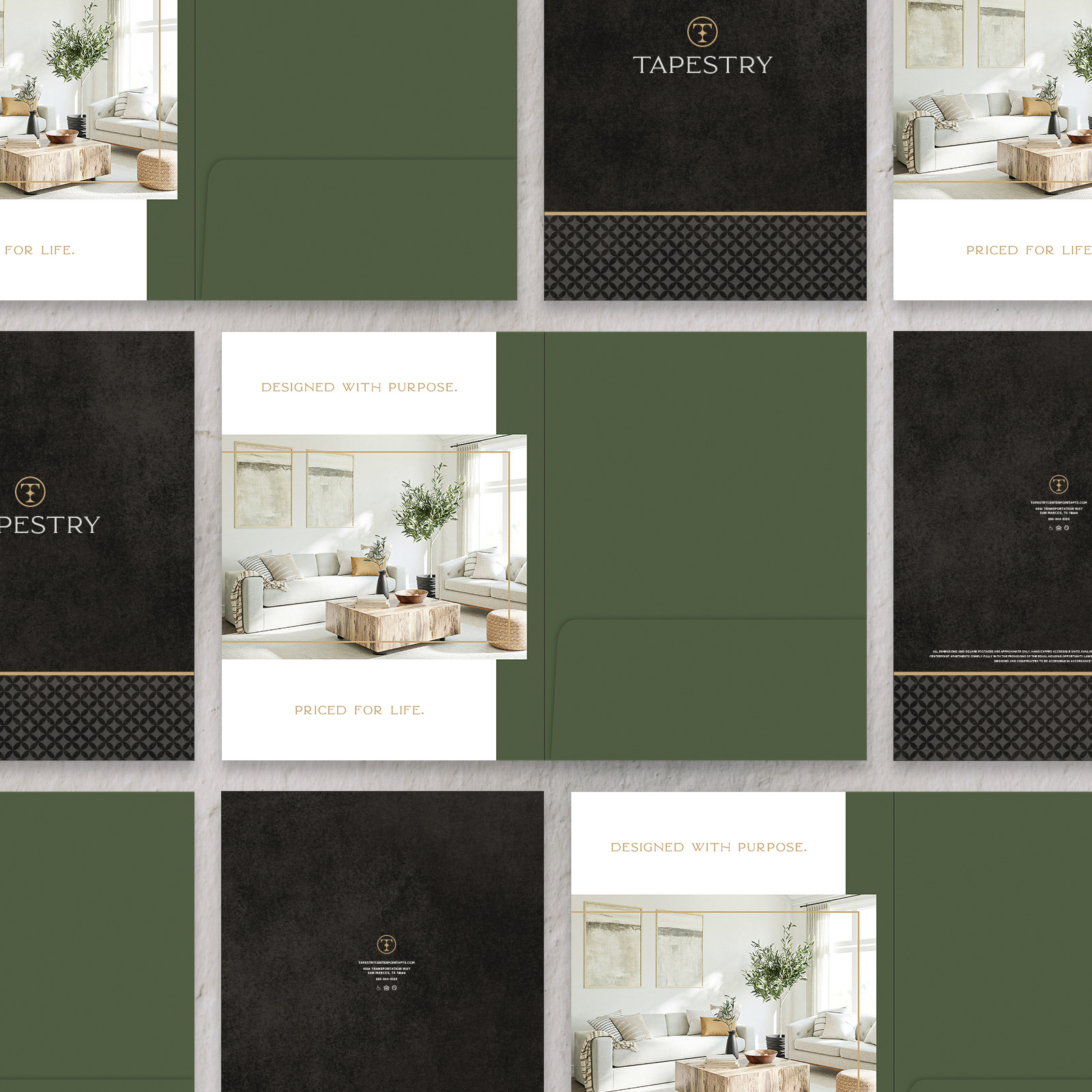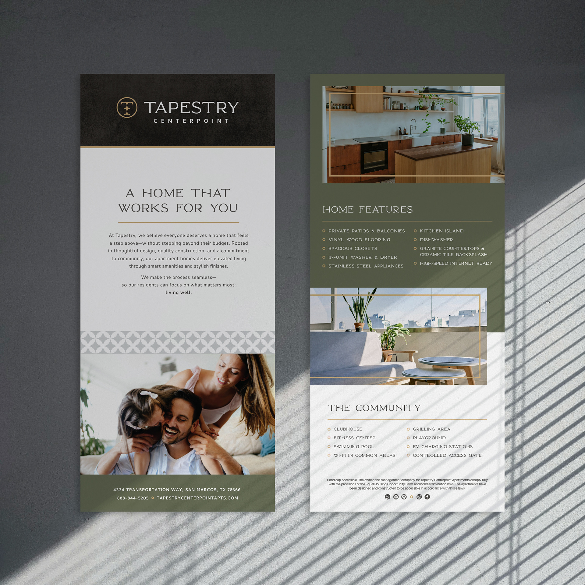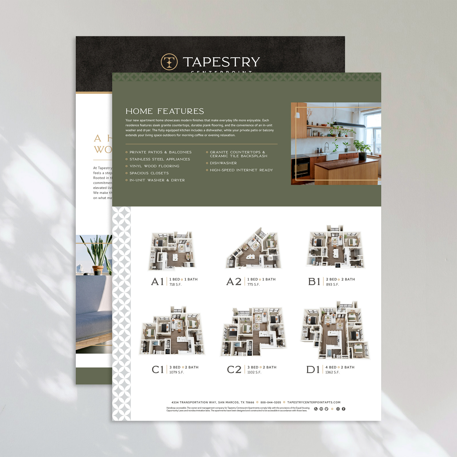 I was tasked with expanding on a brand concept and buildĀ out a collateral package to be used by Tapestry Apartment Homes across their multiple properties. Tapestry Apartment Homes areĀ modern-living, community-driven complexes that target medium-to-high earning individuals and young families.